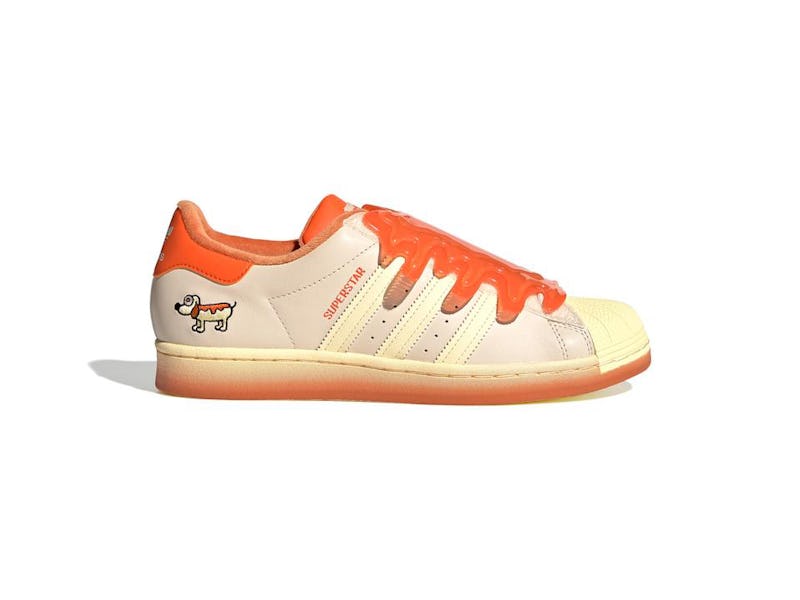 Then there's the second pair, which is definitely the coolest, switches up the classic Superstar silhouette the most. In colorway “Linen Brown / Energy Orange / Pure Orange / Black,” this sneaker’s laces are hidden underneath a bright orange blob on the tongue, which is attached via unseen velcro. This feature makes it a sneaker like no other, and its neon orange color sure makes them a statement. On the backside of the shoe, there’s an embroidered dog dressed as a hotdog. Furry orange lining, retro Superstar branding, and an ombre sole seal the deal on this literal weiner-dog-themed pair.