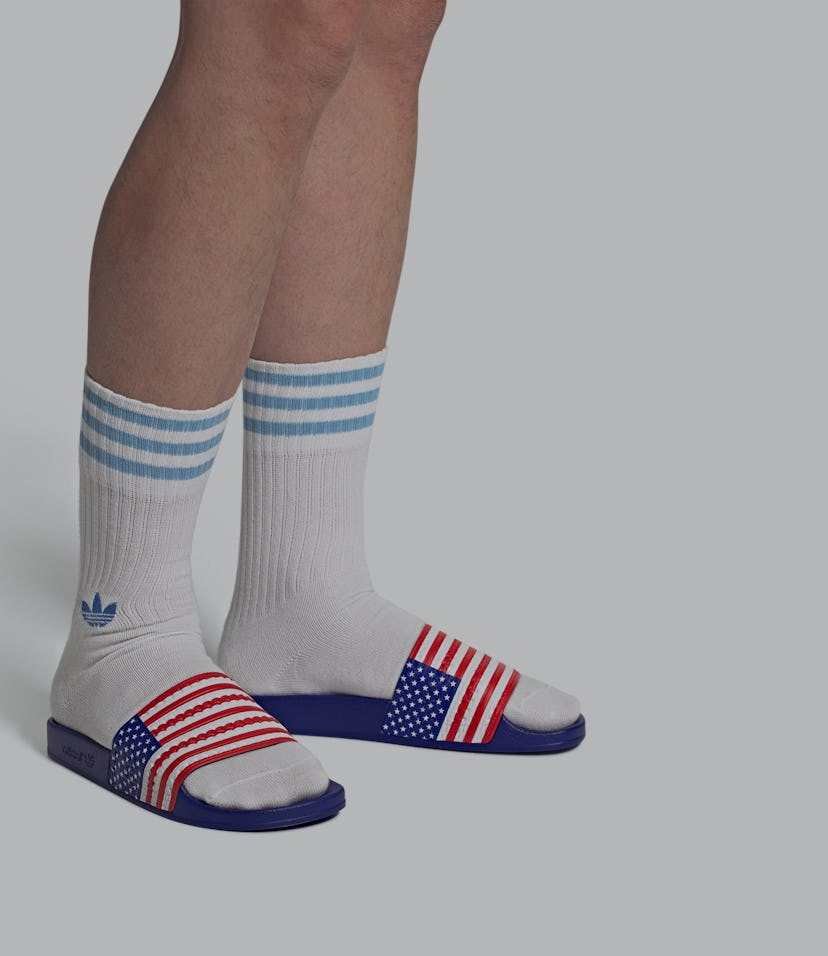 Look, there's nothing wrong with being patriotic. Because who doesn't love eating hot dogs, burgers, chugging beer, and lighting up fireworks on July 4 to celebrate the birth of America? But there comes a point where, as a human, you have to question your life choices — and wearing a U.S. flag on your sandals is up there with attaching a large star-spangled banner to the back of your pickup truck. These acts scream desperation, and they should be banned from society. Still, if you're the type of person who just needs to scream "'MURICA!" with every move, Adidas may have designed footwear you can't resist, the "USA" Adilette slides.