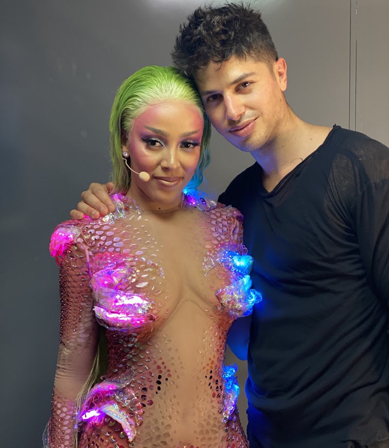 Over the past decade, the designer has made himself the go-to contact for anyone looking to flirt with the future, asking his clients how they choose to express and reflect technology’s presence within fashion. At 33, he’s already created a number of iconic outfits, including the renaissance-esque robot suit Lady Gaga wore during her 2018 “Enigma” residency, Doja Cat’s “alien fish goddess” look at the 2020 VMAs, and the luminescent bodysuit Lil Nas X wore in his headline-making “Call Me By Your Name” music video.