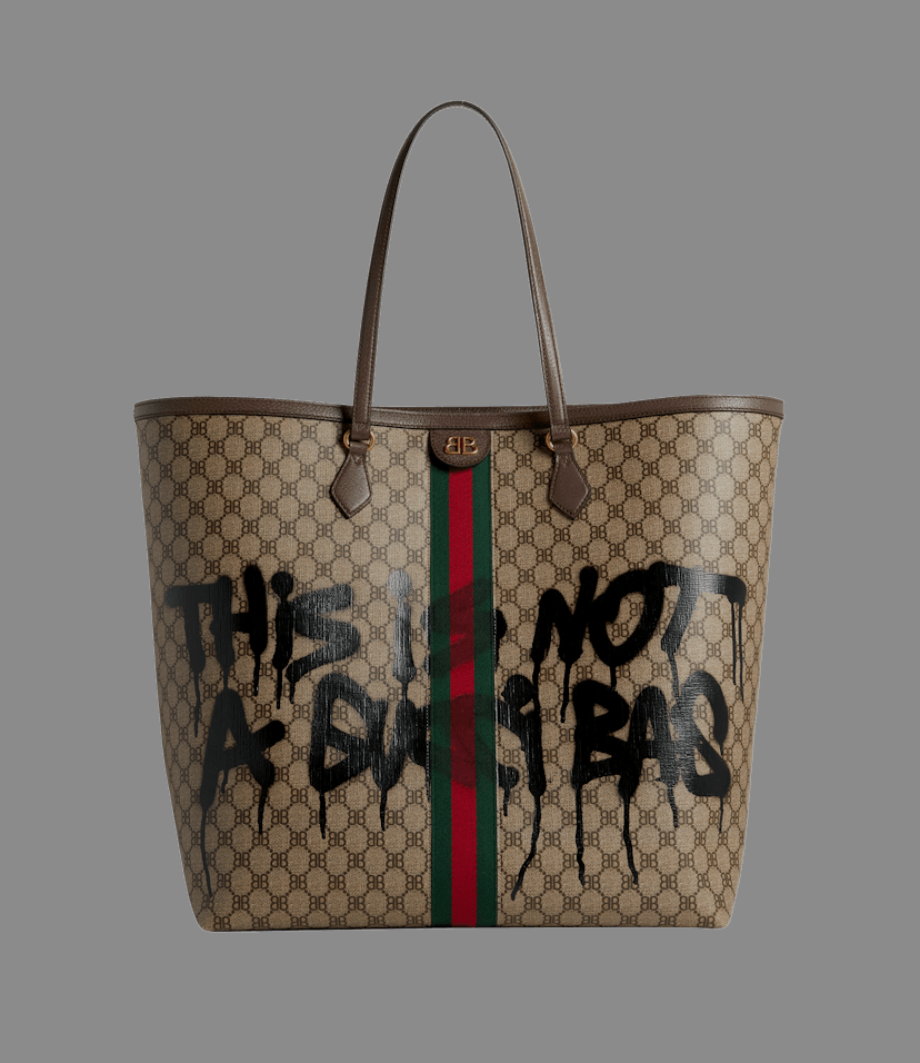 The “This Is Not a Gucci Bag” is a reference to René Magritte’s 1929 The Treachery of Images painting, but also to Gucci’s vandalism of its own products. The brand’s “Fake/Not” capsule slaps the printed message on its accessories as an in-house laugh at all the bootlegs that have flooded the market — and now Gvasalia and Balenciaga are in on the joke too.
