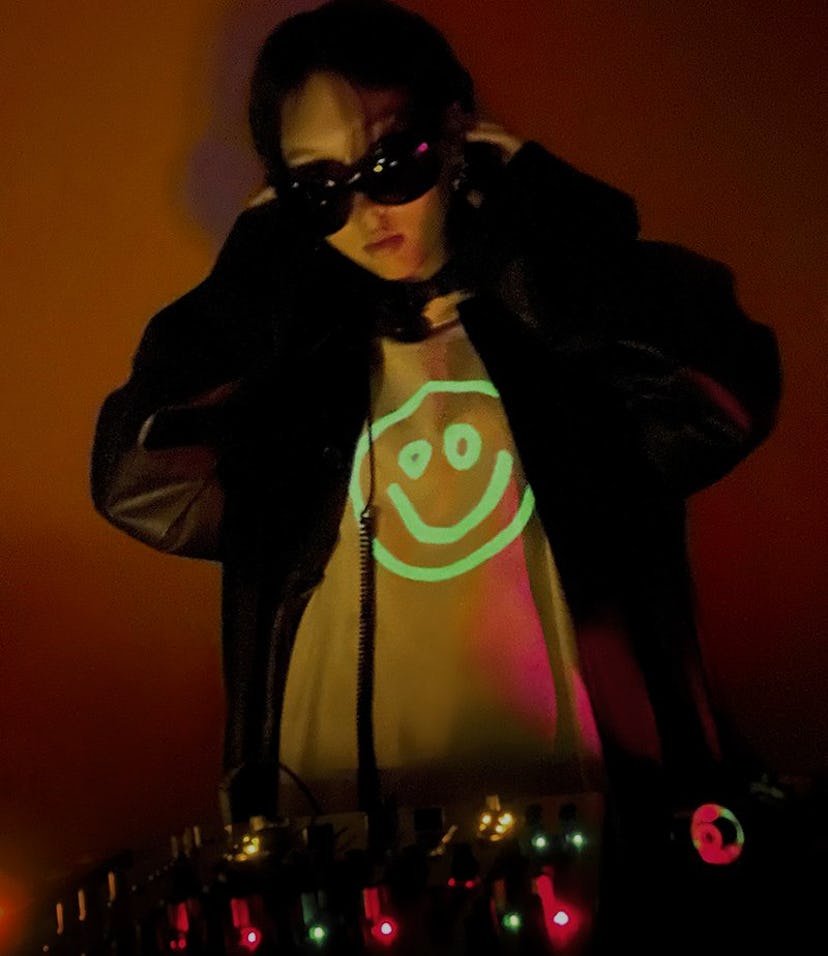 The collection transforms from day to night. T-shirts, especially those dressed in white, almost look plain before their motifs are exposed to a light source. The light tops naturally glow under a UV light, though, while their smiley face designs appear in a neon green hue, making it look like the faces were drawn onto the tee.
