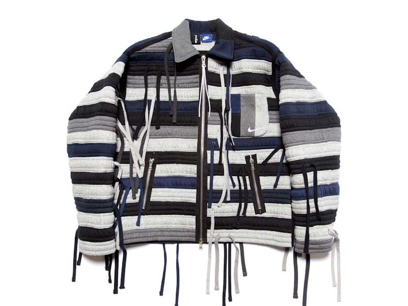 Flex these features — The two newest creations from Clothsurgeon incorporate shades of navy blue, gray, and black, sewn together in a striped pattern reminiscent of old prison uniforms (in a cool way). The collared jacket comes with a two-way Riri zipper, front zip-up pockets, and a chest pocket featuring Nike’s signature Swoosh. The entire coat is covered in functioning waistband drawstrings so you can customize the look or keep the fringe. Very cowboy chic.
