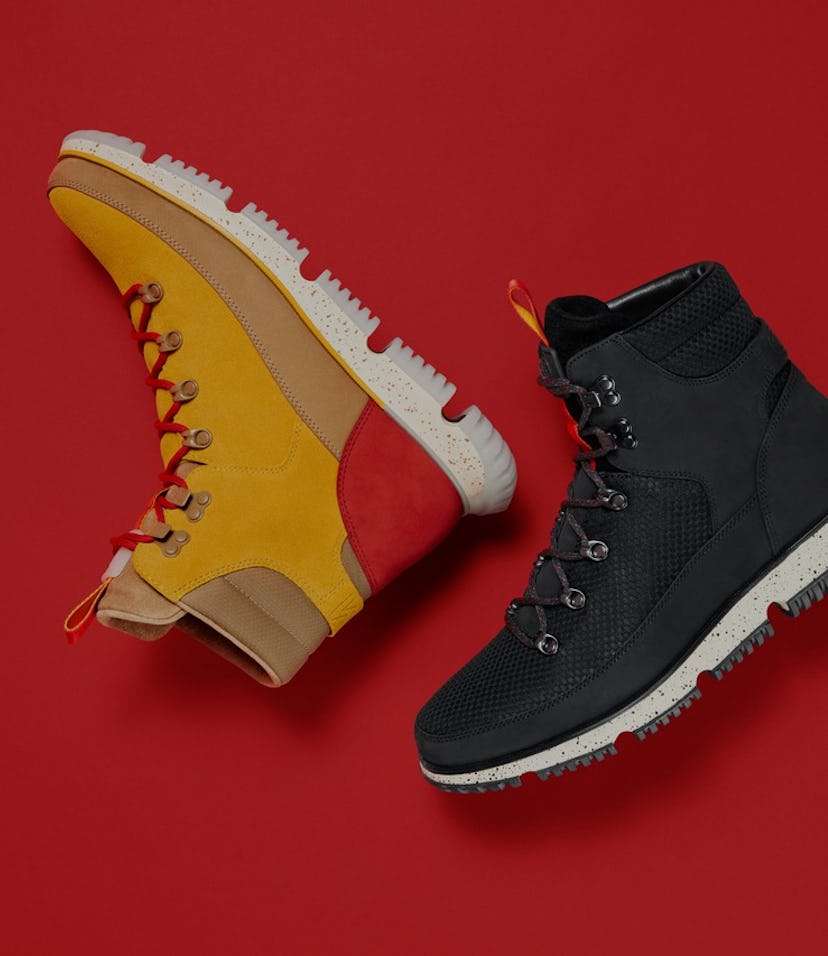 The red and gold color scheme could also work on a superior silhouette, say the classic Timberland 6-Inch or one of Nike ACG’s sneaker-boot bangers. Here, it could only be paired with some harmless chinos, a modest sweater, and a leather coat from Burlington Coat Factory.