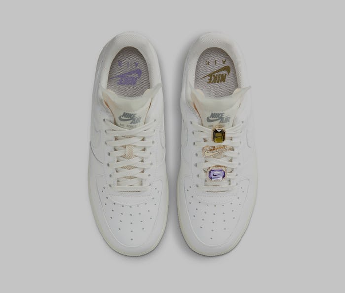 Yellow and purple jewels, akin to ‘80s costume jewelry, are interwoven into the left shoe’s lacing unit to add a bit of namesake bling to the Air Force 1. Each charm boasts a black Swoosh graphic inside its gem, while a third jewel — a gold bedazzled Swoosh — makes the concept clearer.
