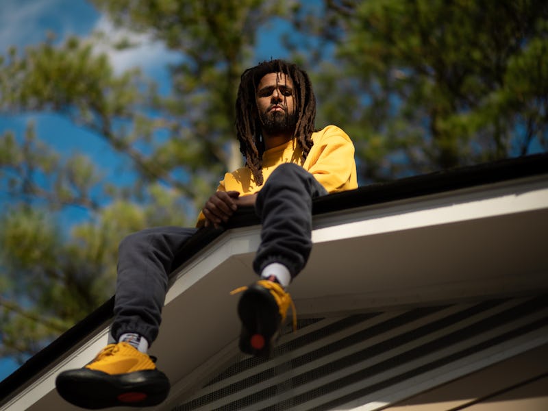 For the new sneaker campaign, Puma and J. Cole have recreated the album cover for his 2015 album. This time, he sits on his childhood home's roof wearing his own shoes and a yellow sweatshirt to match. A press release insists you should find this inspiring, as if J. Cole's stare now says, "I did it, now it’s your turn."