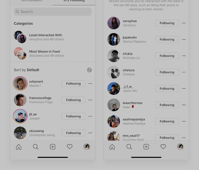 Following Categories — The feature, which can be accessed by tapping “Following” on your profile, splits your followers into a few categories, including “Least Interacted With” and “Most Shown in Feed.” The categories use data from your Instagram activity for the last 90 days.