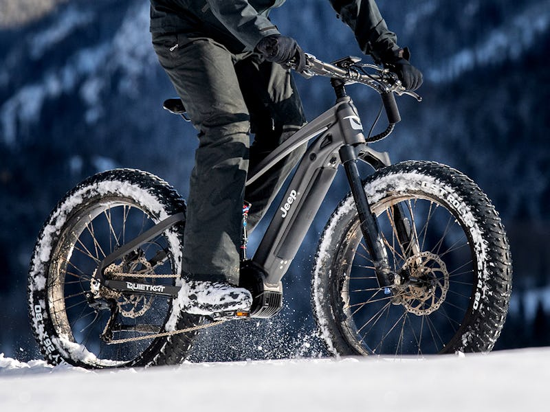 Behold the e-Bike — Known simply as the e-Bike, Jeep teamed up with QuietKat for its first foray into the field. A 750-watt electric motor gives the e-Bike a range of up to 40 miles on a single charge. The thick 4.8-inch tires and a Fire-Link suspension allow it to tackle extreme terrain. QuietKat, no stranger to electric bikes, touts it as "the most capable off-road electric mountain bike there is."