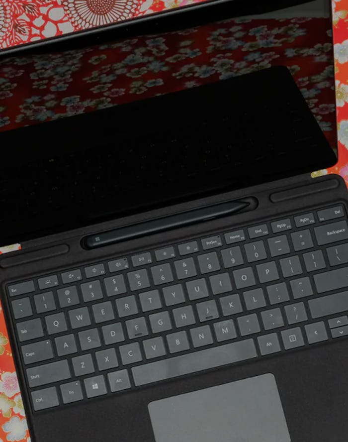 The backside features a kickstand that can put the device in almost any position — including almost laying flat — but I will say the edges are so sharp that I think one of them gave me a cut on my thumb. The device pairs with a springy, full-size keyboard cover coated in Alcantara (a fuzzy, suede-like material) that cleverly hides the new Slim Pen stylus inside. Typing feels great, though the keys have slightly less travel than a typical Surface Pro keyboard cover. The trackpad is a bit small for my taste, but it works flawlessly, which is still surprising for a Windows trackpad in 2019. The whole package looks and works like a laptop from the future; folding and reconfiguring with few hardware trade-offs.