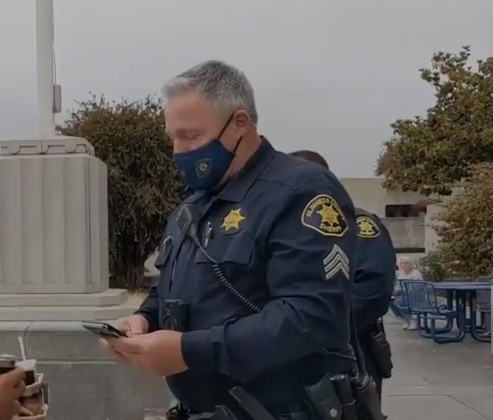 “I don’t know why we’re — are we having a dance party right now?,” one of the protestors asks. “No, sir,” the deputy responds. “Are you playing pop music to drown out the conversation?,” another protestor presses, incredulous.