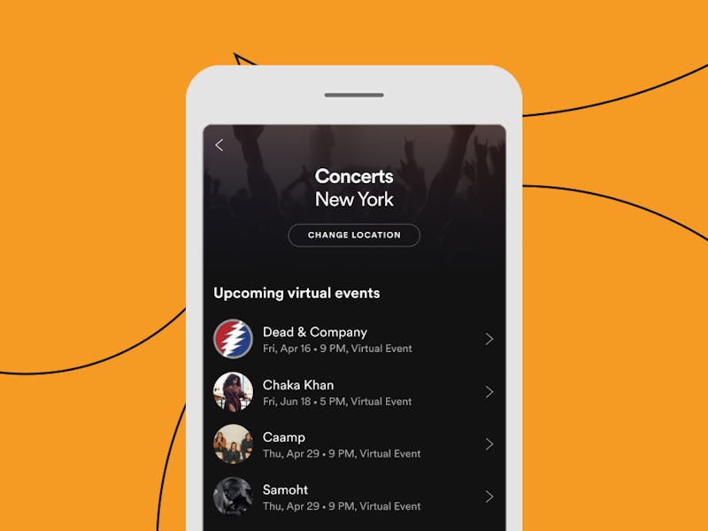 How do I watch? — If you're a Spotify user, you can access the live platforms’ catalogs of virtual events via Spotify's Concert tab. You should see various artists under the "On Tour" section on iOS, Android, and the regular desktop Spotify apps. The recommendation algorithm will sift through the genres, musicians, and moods you're into to offer up suitable recommendations.