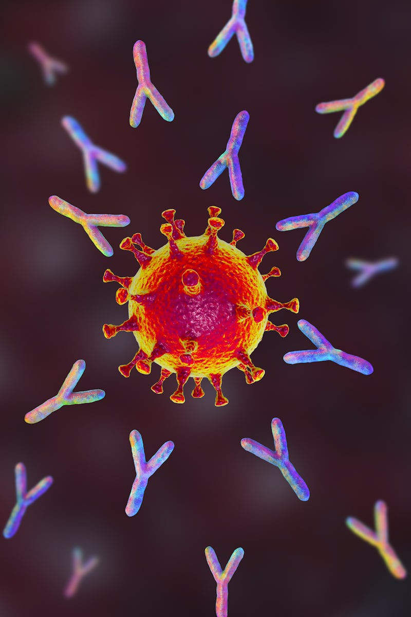 An artists' rendering of the coronavirus and antibodies, proteins produced by the immune system that can recognize it and declaw it.