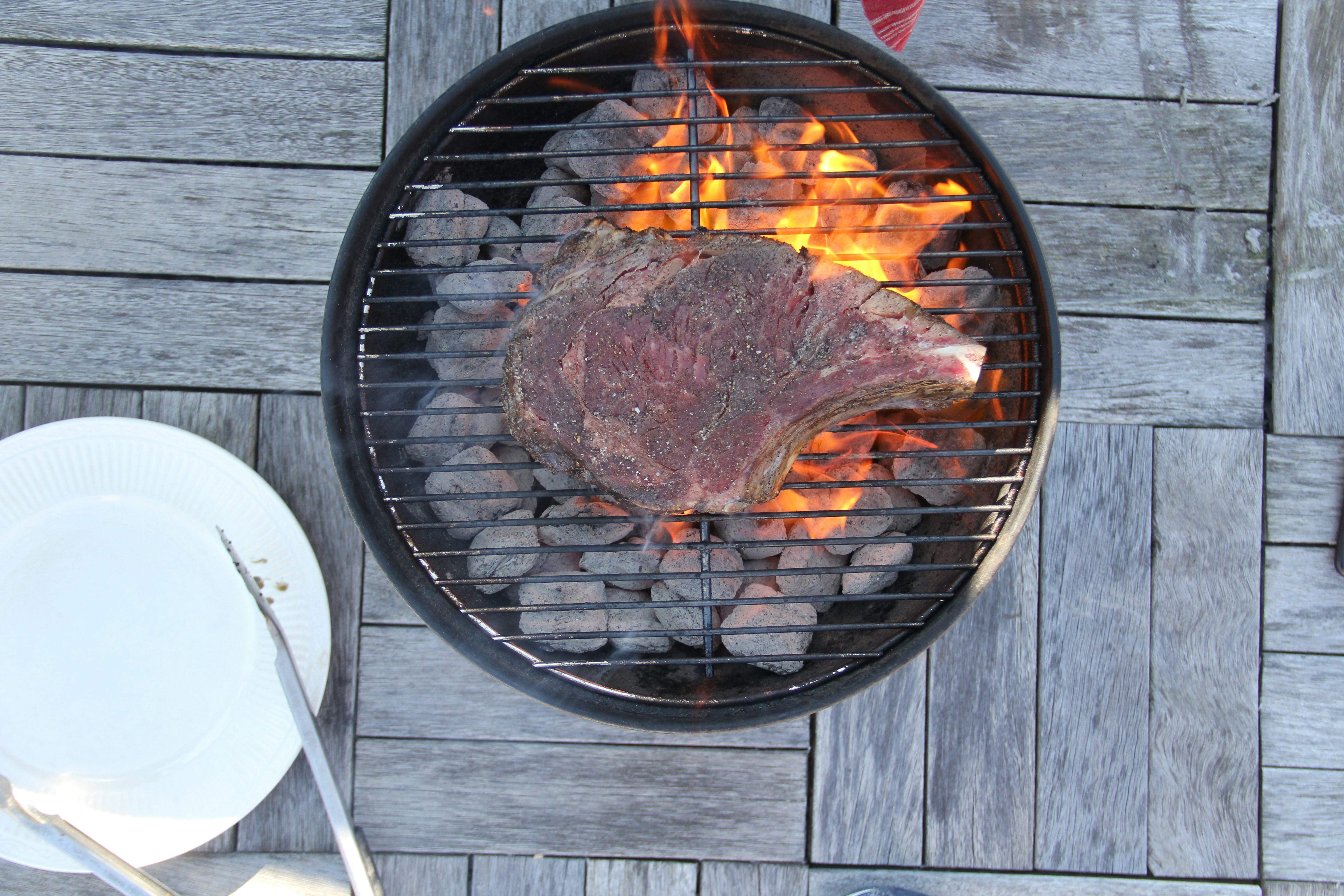 The charcoal instructions that I followed suggested using 4 pounds of charcoal in a grill. Unfortunately, I neglected to account for the fact that the grill on my roof is tiny. The charcoal was concentrated inside a small area, stacked high on top of itself, in a pile that reached close to the meat. My steak was hovering only inches above the searing hot briquettes.